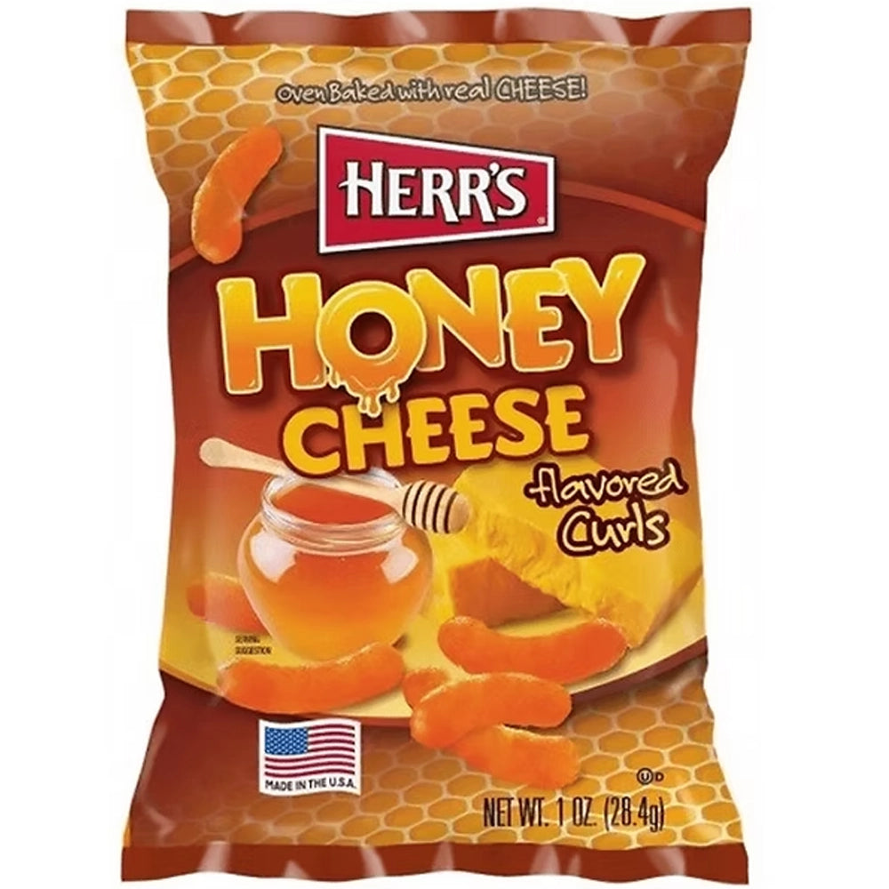 Try Herr’s Honey Cheese Curls! Light, fluffy cheese puffs flavored with real cheddar and honey—for a sweet, savory, and crunchy snack you’ll love.