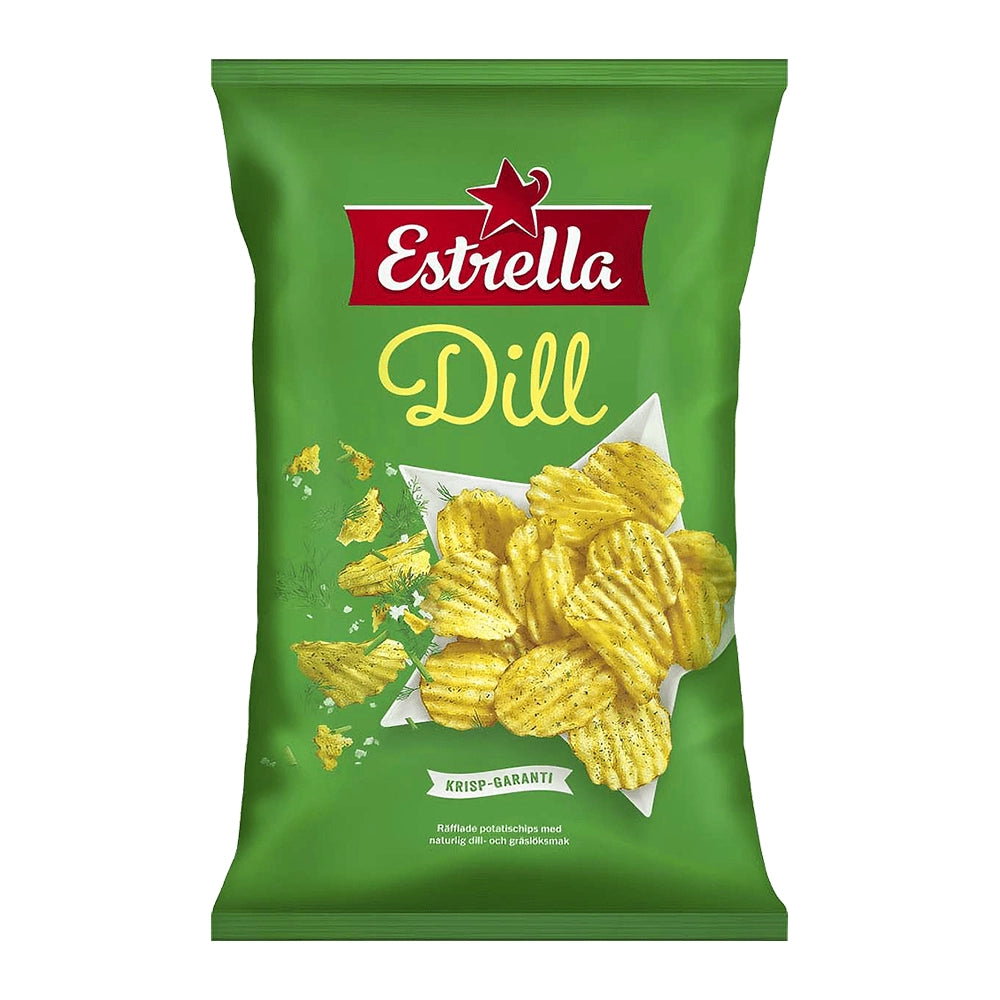 Enjoy the fresh, herbaceous flavor of Estrella Dill Potato Chips, a perfect blend of crispiness and aromatic dill. Ideal for elevating your snack moments. A true Swedish classic.