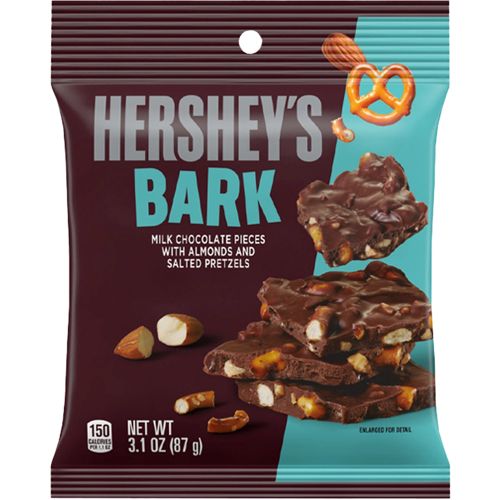 Try Hershey’s Bark Almonds & Salted Pretzels! Milk chocolate bark with crunchy almonds and salty pretzel bits—perfect for a tasty snack any time.