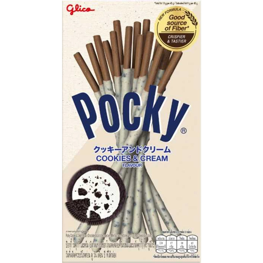 Pocky Cookies & Cream has biscuit sticks coated in white chocolate and cookie bits. It’s sweet, crunchy, and perfect for a tasty snack anytime.