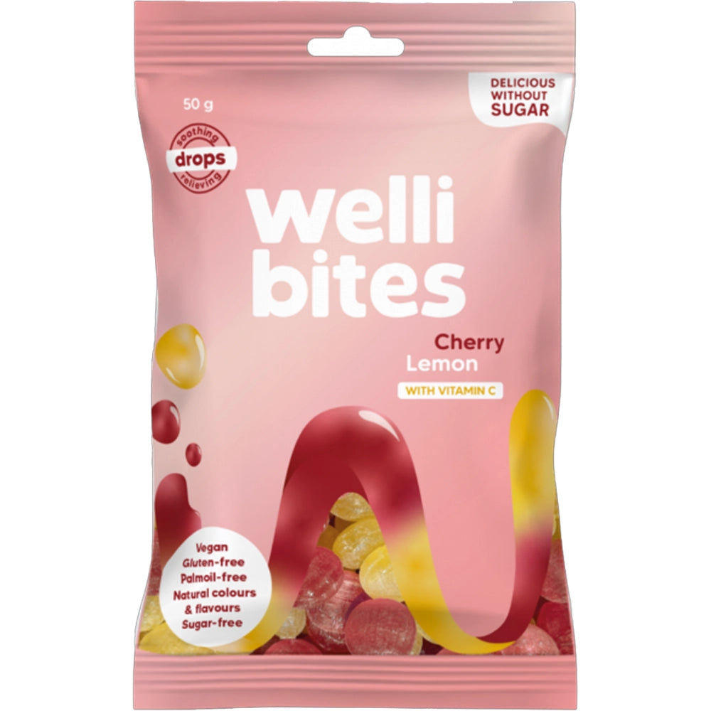 Wellibites Drops Cherry Lemon combine sweet cherry and tangy lemon in sugar-reduced, vegan candies. A healthy and refreshing snack perfect for anytime enjoyment!