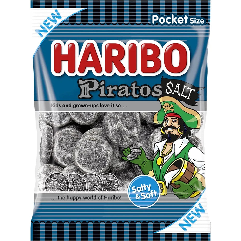 Haribo Piratos Salt are salty licorice candies shaped like pirate coins. They’re strong, chewy, and perfect for fans of bold, classic licorice flavor.