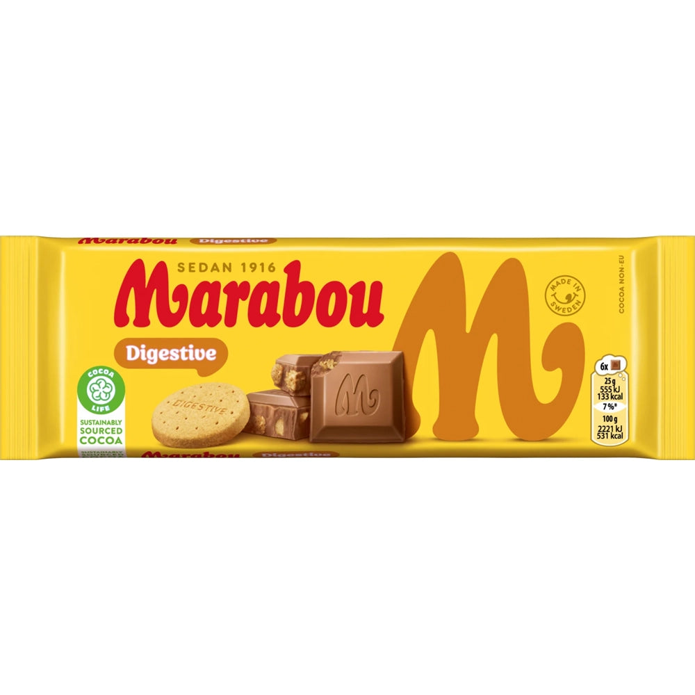 Marabou Digestive combines the rich, creamy taste of Marabou milk chocolate with the crunchy, wholesome texture of digestive biscuits for an irresistible treat. This delightful chocolate bar offers a perfect balance of sweetness and biscuit crunch, making it an ideal snack for any time of day. Whether you're enjoying a moment of solitude or sharing with friends, Marabou Digestive is a comforting, delicious choice for biscuit and chocolate lovers alike.