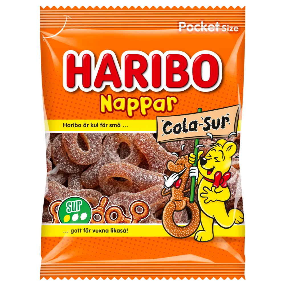 Haribo Nappar Cola Sour offers a tangy twist on the classic cola flavor, delivering a burst of sour goodness in every bite. These chewy candies are shaped like pacifiers and feature a delightful combination of sourness and sweetness that will keep you coming back for more. Whether you're a fan of sour candies or craving a nostalgic treat, Haribo Nappar Cola Sour is sure to satisfy your taste buds and add a playful touch to any snacking occasion.