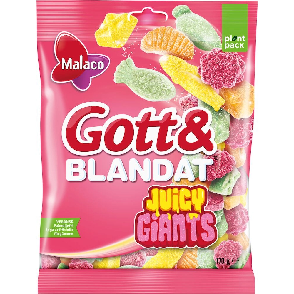 Malaco Gott & Blandat Juicy Giants are extra-large gummy candies with sweet and tangy fruit flavors. A fun and chewy treat perfect for snacking and sharing!
