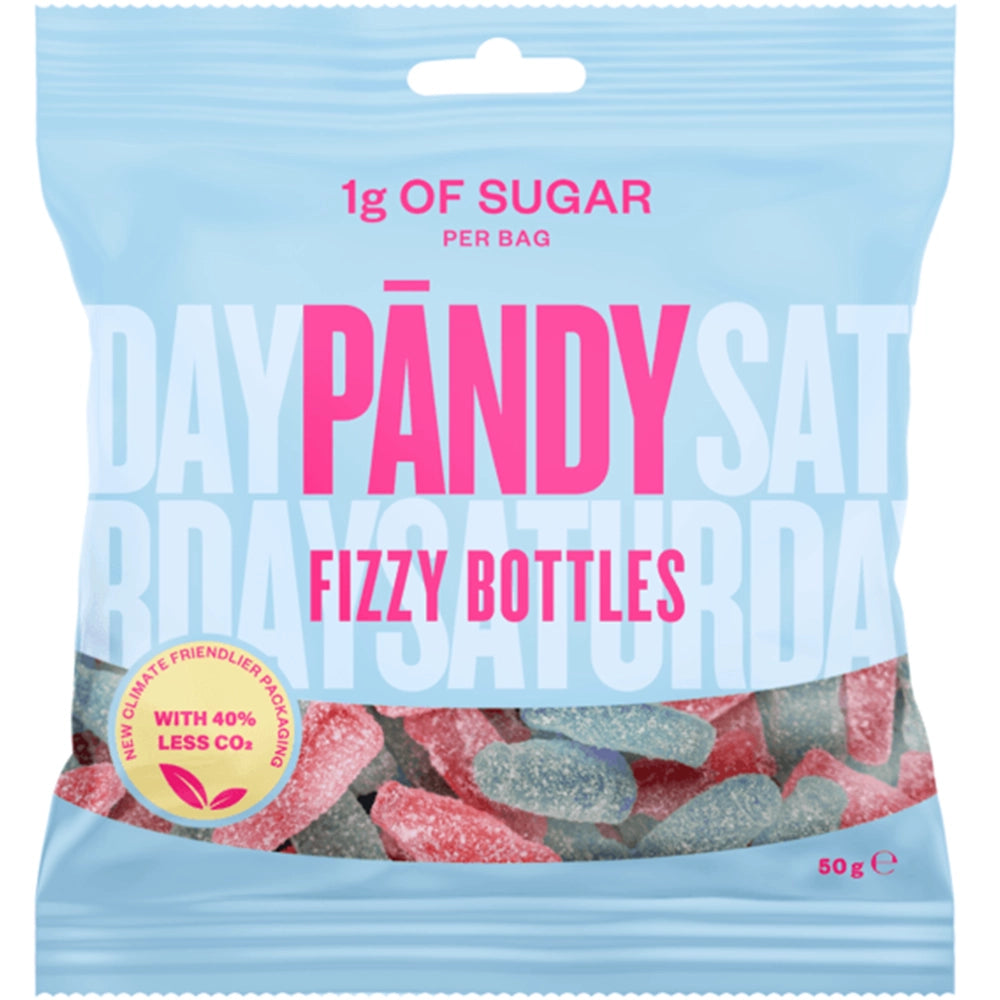 Pandy Fizzy Bottles offer fizzy, bottle-shaped gummies with only 1 gram of sugar per bag. A delicious, low-sugar treat with sweet and sour flavors.