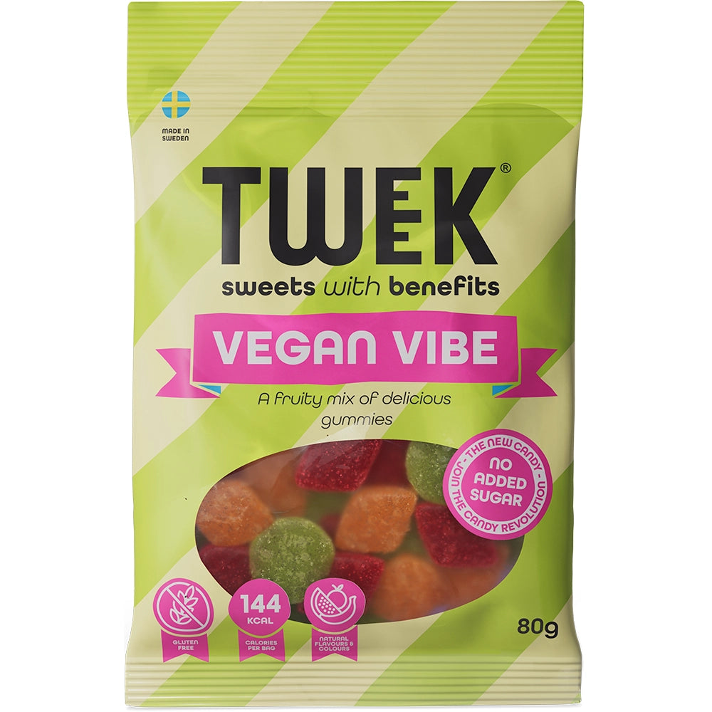 Tweek Vegan Vibe is a plant-based, sugar-reduced candy bursting with bold fruity flavors. Made with natural ingredients, these chewy treats are perfect for vegans and candy lovers seeking a guilt-free indulgence. Ideal for snacking or sharing, they deliver a delightful mix of flavor and texture in every bite. Enjoy the refreshing and satisfying taste of Tweek Vegan Vibe, a healthier and delicious option for sweet cravings.
