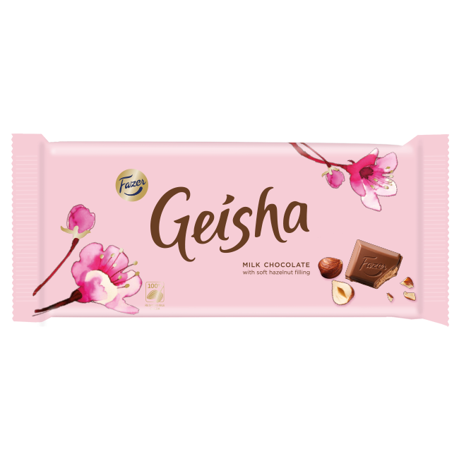 Discover the delicate indulgence of Fazer Geisha Milk Chocolate, with creamy chocolate and soft hazelnut nougat. A luxurious, refined treat for sophisticated palates.